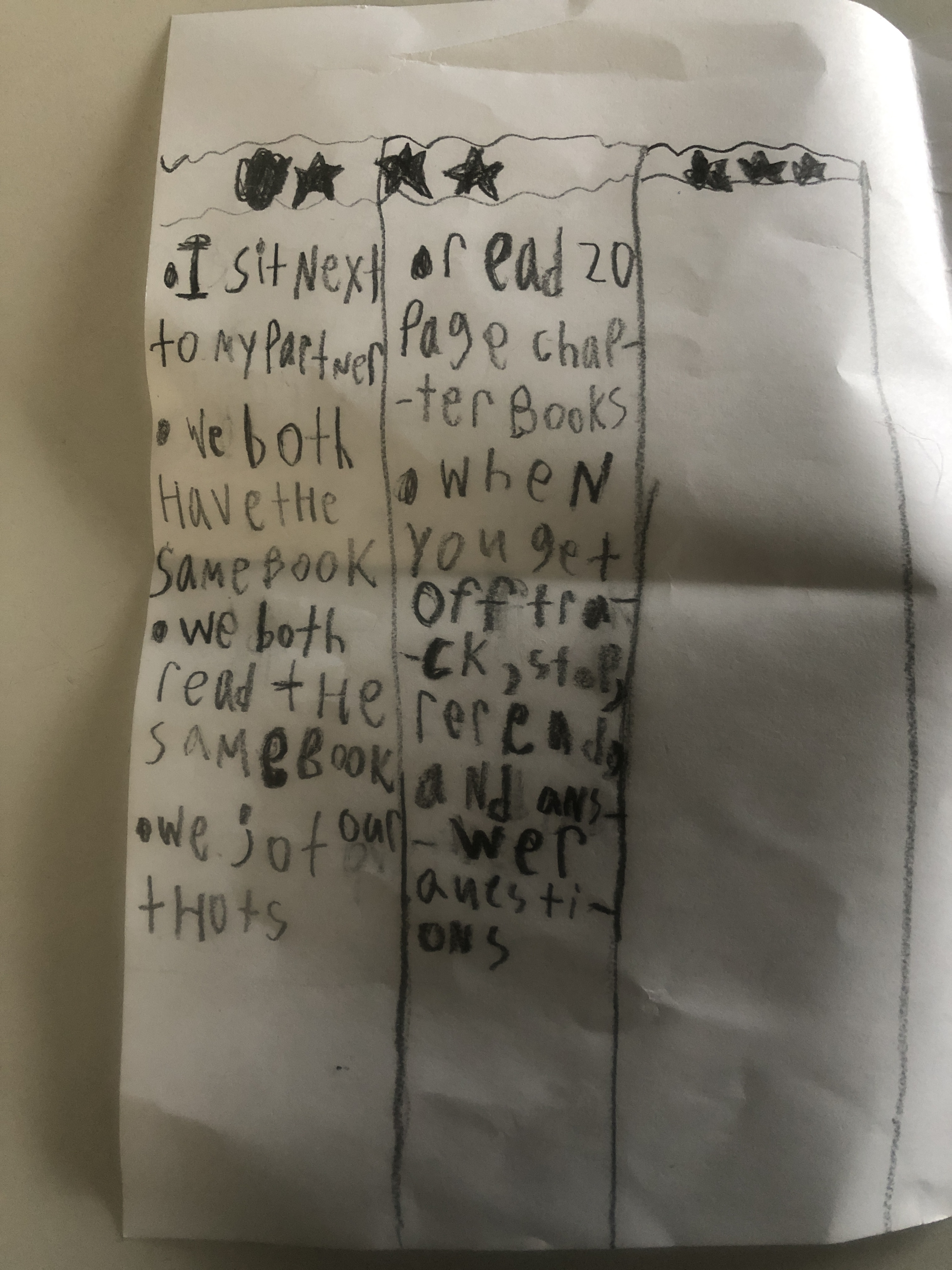This beauty (at least I think it’s lovely) took a whopping six minutes to create. I identified a skill that needed refining in my classroom (same-book partner reading behaviors), I broke down that skill into developmental levels, I recorded the details that encapsulated the current levels of my students as well as where I wanted them to go next (I currently have kiddos sitting squarely in the first three columns), and I shared it with my class. We discussed it. They loved it. This is a clear metric that makes sense to them, helps them identify where they are on any particular day, doesn’t judge them for somehow lacking in this skill area, and it lets them know the next steps to gain skills as a same-book partner.