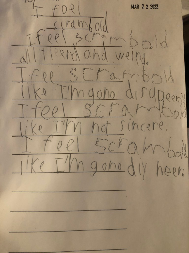 Then we wrote a poem together to try to explore using precise language to describe feelings. Here is our joint creation: