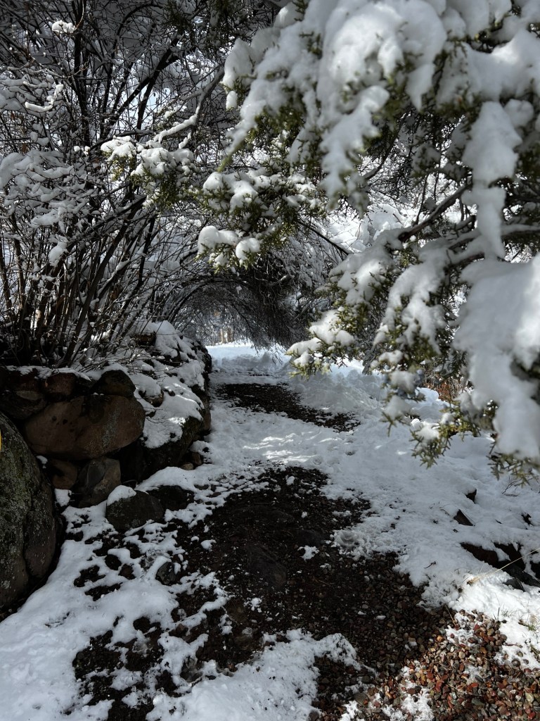 What does it mean when that heavy dense snow bends the branches way over and you have to walk through a perilous tree tunnel to gather the chickens’ eggs, even when you’re home after skiing and most of the ground snow has melted away?